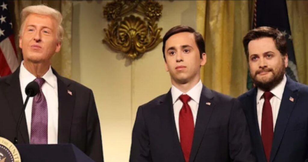 Padilla’s Noem was then joined by the fan favorite Jost as Hegseth who perfectly captured the aggressiveness of the Defense Secretary, a quality of the portrayal which fans have loved increasingly since his debut last season. Jost’s Hegseth appeared on stage and said, “Now listen up in case your ears are too fat to hear the news! We went into Venezuela and, como se dice? We tea-bagged their country!”